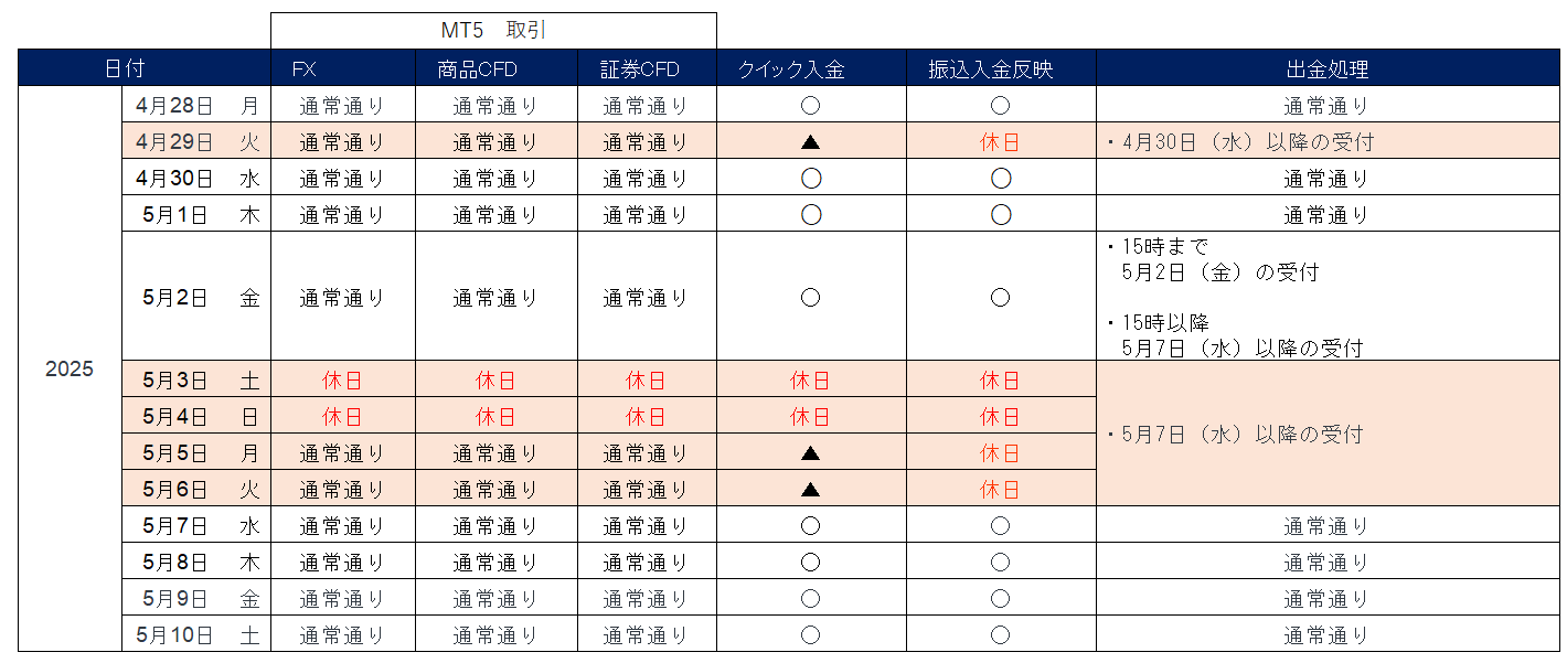 ゴールデンウィーク前(5月2日(金))にご出金が完了するのは「4月30日(水)15時まで」のご出金依頼弊社受付け分となります。