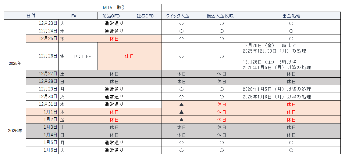 2025年12月31日~2026年1月4日まで弊社担当部署が休日のため振込入金反映および出金処理ができません。