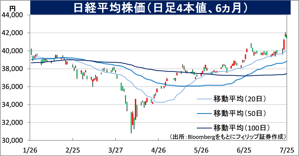 - これらの資金供給の可能性に加え、参院選後の政局の動向次第では、政府が財政支出拡大策へ政策転換を行う可能性がある。これらは、日本株市場を力強く押し上げる要因になると想定される。日経平均株価(加重平均ベース)日次終値の1株当たり純資産(BPS)は7/24で2万7884円の水準にある。過去10年間の日経平均株価のPBR(株価純資産倍率)の最大値は、昨年の7/11の57倍であることから4万3000円台後半までの潜在的な上昇余地も考えられる。海外投資家による日本の現物株と先物合計の売買は、7月第2週(7~11日)まで13週連続の買い越しとなり、年初来の累計でも初めてプラスに転じた。買い余力は残っているとみられる。企業のBPSは、原則的には赤字にならない限り増加すると考えられる。主要225銘柄から構成される日経平均株価ベースのBPSは、決算発表を経て上昇すると見込まれる。