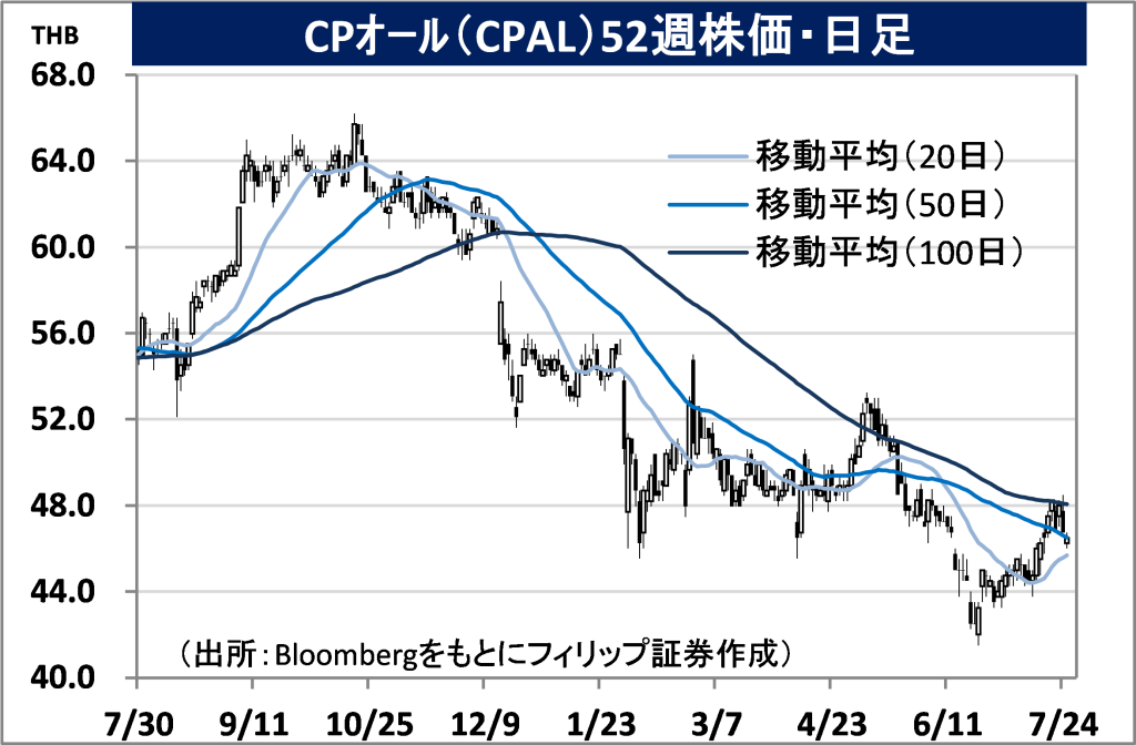 ・5/13発表の2025/12期1Q(1-3月)は、総売上高が前年銅期比4.8%増の2528億THB、EBITDAが同7.6%増の236億THB。1日当たり来店客数は減少も、1回来店チケット当たり消費支出額の増加が寄与して既存店売上高は3%増加。英テスコから買収した小売部門のロータスが利益面で貢献した。