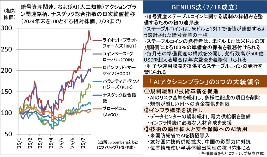 暗号資産で米ドルに価値を連動させる「ステーブルコイン」の普及を目指す「GENIUS法」が7/18に成立。ステーブルコイン「USDC」の発行元のサークル社の傘下で、関連インフラを提供するサークル・インターネット・グループ(CRCL)が6/5に新規上場。暗号資産関連ではビットコインのマイニング事業を展開するライオット・プラットフォームズ(RIOT)、暗号資産取引サービスを提供するコインベース・グローバル(COIN)やロビンフッド・マーケッツ(HOOD)の株価が堅調に推移している。