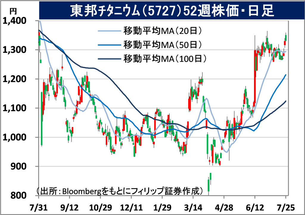 ・2026/3通期会社計画は、売上高が前期比3.7%増の923億円、営業利益が同26.9%減の43億円、年間配当が同横ばいの18円。親会社であるJX金属の林社長は、子会社である同社との資本関係を見直す必要性を認識している旨を公表している。また、日米関税交渉の合意には日本が米ボーイング製の航空機を100機購入する内容が含まれており、同社の金属チタン事業へ恩恵が見込まれる。