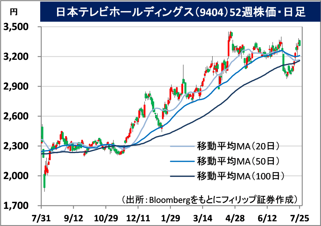 ・5/8発表の2025/3通期は、売上高が前期比9.1%増の4619億円、営業利益が同31.1%増の549億円。地上波テレビ広告収入(売上比率48%)が1%増収、コンテンツ販売収入(同20%)が17%増収、コンテンツ制作収入(同6%)が20%増収、BS・CS広告収入(同3%)が5%増収と、堅調に推移。