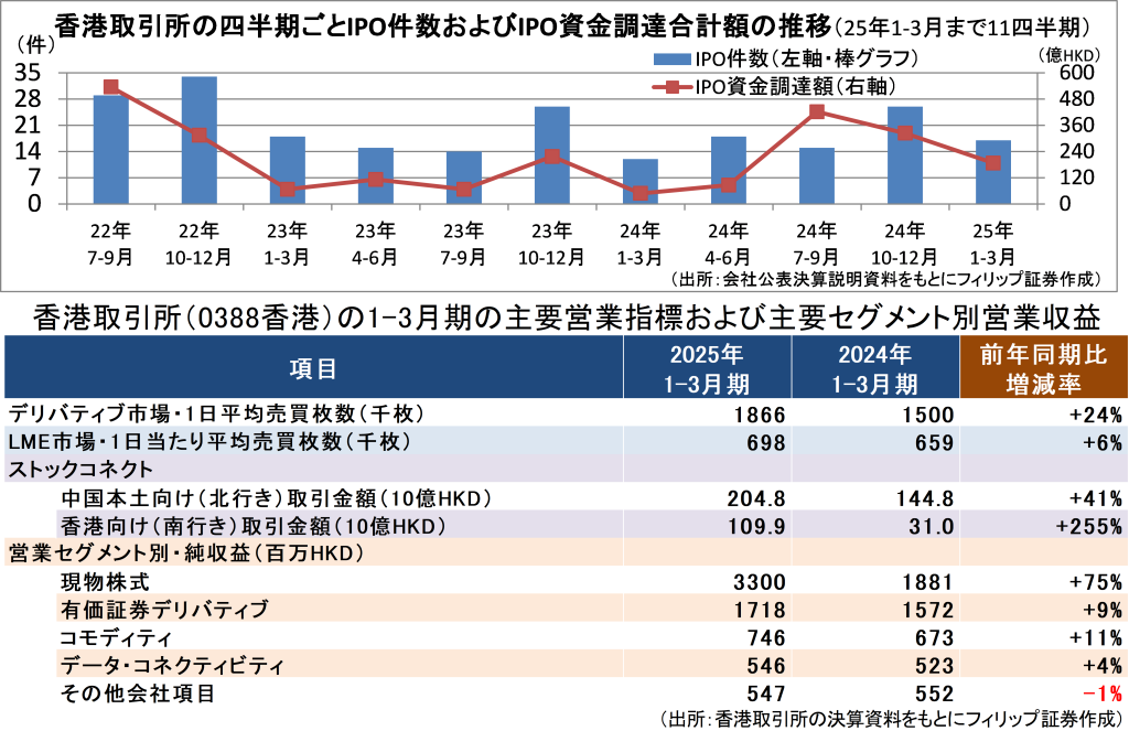香港のIPO(新規株式公開)市場が堅調に推移している。2025年1-6月の資金調達額は1000億HKD(約1兆8000億円)を超え、上半期で世界首位に返り咲いた。香港取引所(0388香港)の1-3月業績も、人気銘柄の大型IPOが相次いだことを契機に、中国本土投資家のストックコネクト経由での売買に牽引された現物株式の売買増加を受けて回復している。