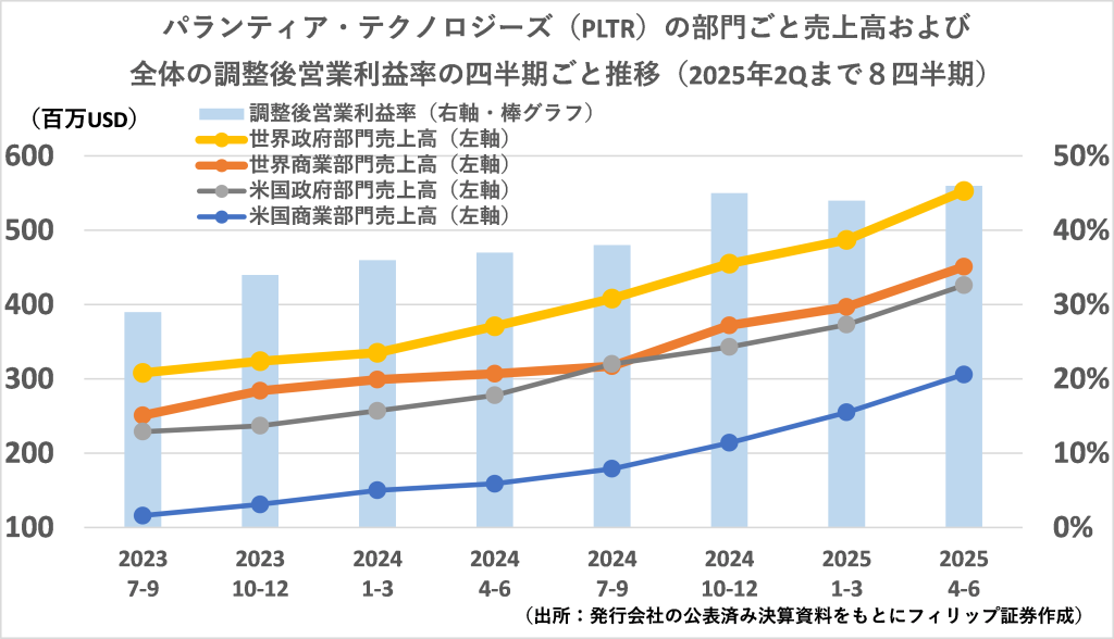 データ解析ソフトの米パランティア・テクノロジーズ(PLTR)が8/4に発表した2025年4-6月期決算は売上高が前年同期比48%増の10.03億USD、純利益が2.4倍の3.26億USD。トランプ米政権に接近して米軍との契約を増やしているほか、民間企業向けのAI(人工知能)関連サービスが伸びたことを受け、全体の7割を占める米国売上高のうち政府向けが53%増、米民間企業向けが93%増と拡大している。