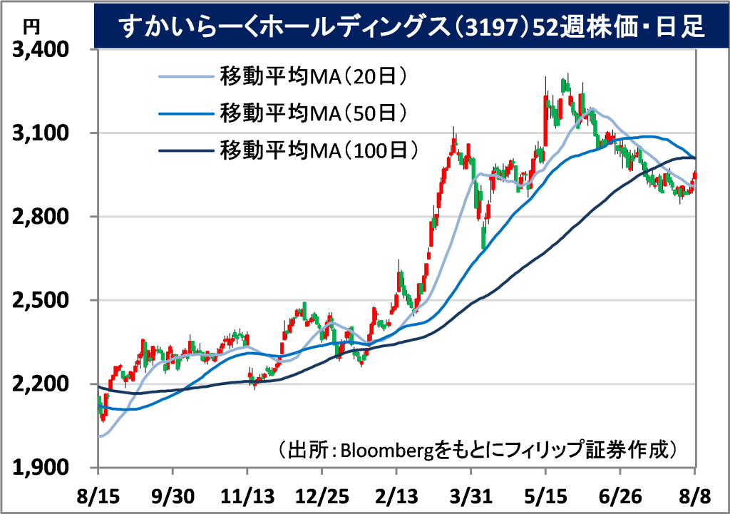 ・通期会社計画は、売上収益が前期比10.9%増の4450億円、事業利益が同13.4%増の275億円、年間配当が1.5円増配の20円。既存店売上高増収率(前年比)は、4月が9.2%増、5月が7.6%増、6月が3.9%増、7月が7.7%増と堅調に推移。客数、客単価ともにプラスの伸びとなっている。衆参両院で少数与党政権となる中、野党の要求に応じて財政支出が拡大すれば消費増加が見込まれる。