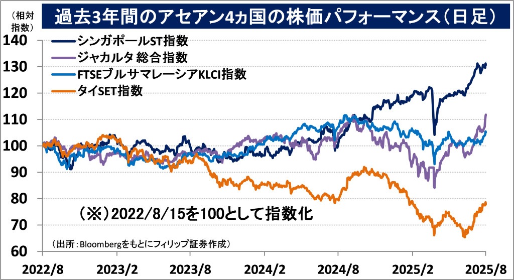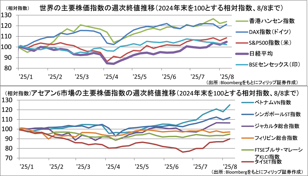 アセアン主要6ヵ国については米関税の影響が当初から小さかったシンガポールに加え、米国との相互関税で合意した関税率で当初提示された率からの引き下げ幅が大きかったベトナム、タイ、インドネシアの株価が堅調に推移している。