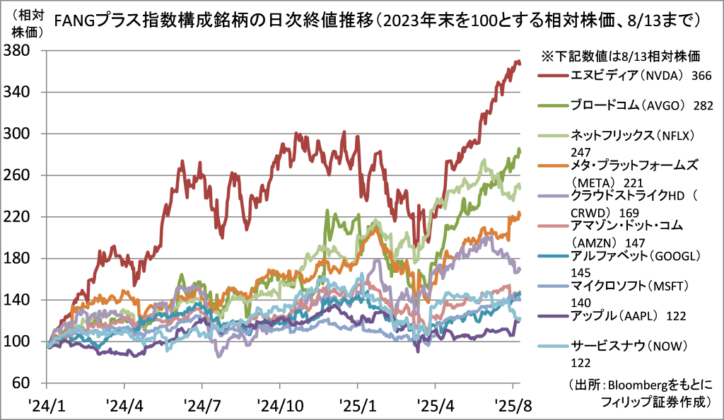 「NYSE FANG+指数」は、米国の大手IT企業であるメタ・プラットフォームズ(META)、アマゾン・ドット・コム(AMZN)、ネットフリックス(NFLX)、アルファベット(GOOGL)の4社にアップル(AAPL)、マイクロソフト(MSFT)の6銘柄が原則として組み入れられ、時価総額や売上高などに基づいて残りの4銘柄が選定される。構成銘柄は四半期に一度見直しが実施され、2024年9月の銘柄入れ替え以降は、残り4銘柄は、エヌビディア(NVDA)、ブロードコム(AVGO)、クラウドストライクHD(CRWD)、サービスナウ(NOW)となっている。