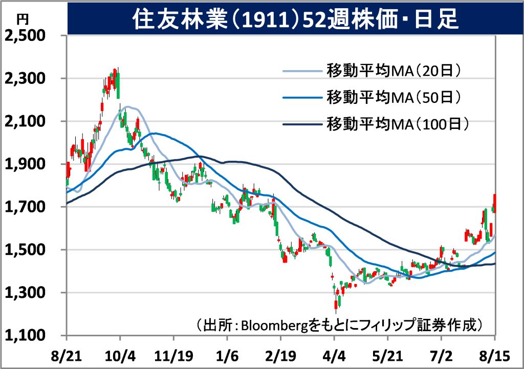・通期会社計画を下方修正。売上高を前期比13.0%増の2兆3200億円(従来計画2兆5560億円)、経常利益を同14.1%減の1700億円(同2050億円)、株式分割遡及後の年間配当を1.66円増配の50円(同60.83円)とした。バリュー投資で知られる著名投資家バフェット氏率いるバークシャー・ハサウエイが8/14、6月末保有状況報告を提出。DRホートンやレナーなど米住宅建設株への投資を拡大。