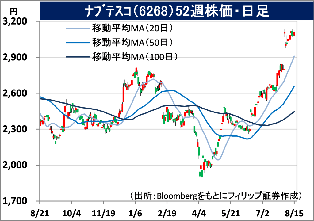 ・通期会社計画を上方修正。売上高を前期比6.4%増の3440億円(従来計画3360億円)、営業利益を同50.8%増の223億円(同187億円)とした。年間配当は横ばいの80円で従来計画を据え置いた。同社は米ボーイング(BA)に対し、航空機の飛行姿勢(上昇・下降・旋回)を油圧制御する「フライト・コントロール・アクチュエーション」を提供。新造船向け・MRO需要を背景に舶用機器も堅調に推移。