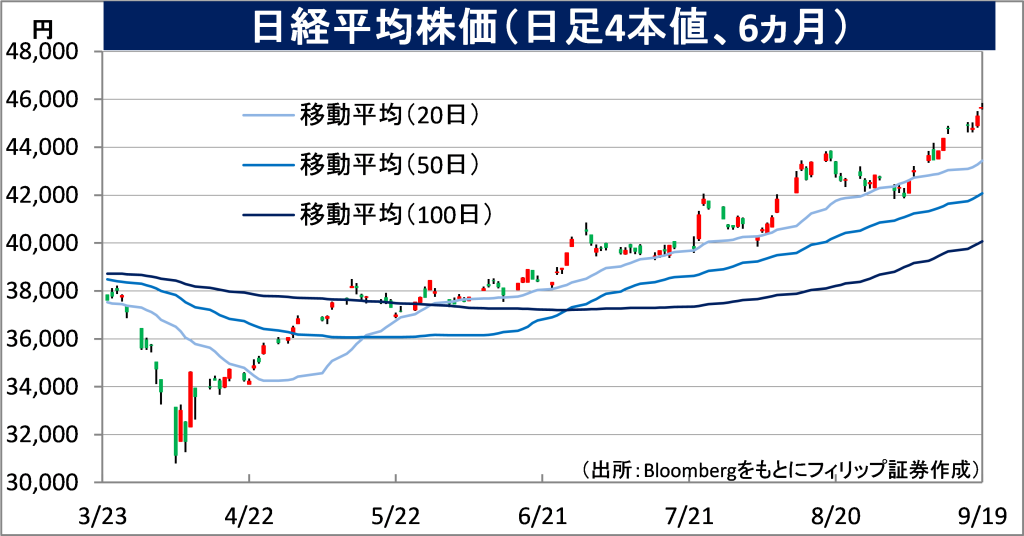 - 短期的には、4/7の安値3万792円から9/19の高値まで114営業日の短期間で約49%値上がりした反動もあり、値幅を伴う下落があっても不思議ではない。テクニカル分析手法の一つである一目均衡表の9/19時点での日足ベースで転換線(直近のローソク足9本分の高値と安値の中心値)が4万4598円、基準線(直近のローソク足26本分の高値と安値の中心値)が4万3843円に位置する。基準線および転換線のそれぞれの近辺で押し目買いから力強く反発するかどうかが、日経平均株価を見ていく上で重要なポイントになると考えられる。