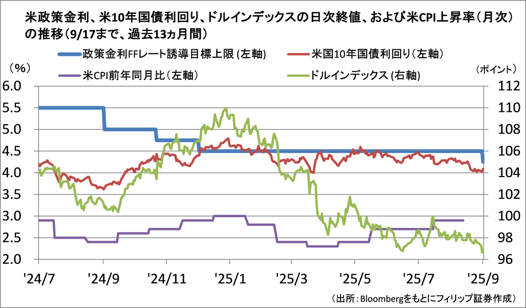 米FRB(連邦準備理事会)が9/17、米FOMC(連邦公開市場委員会)で6会合ぶりに0.25ポイントの利下げを決めた。FRBによる最新の金利・経済見通しでは年内残り2回の会合でそれぞれ0.25ポイントの利下げが決定されるとの予想が示された。