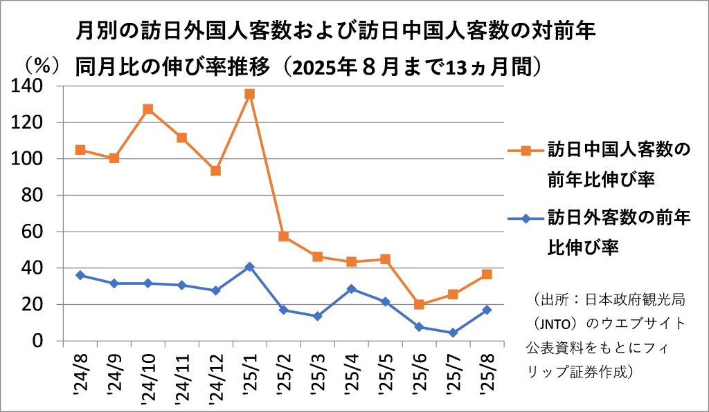 日本政府観光局によれば、8月の訪日外国人旅行者(推計)が前年同月比16.9%増の342万8000人に達した。前年同月比の伸び率は4-7月の減速傾向から反転して再加速の兆しを示した。7月は日本で地震が発生するという情報がSNS等で拡散された影響もあり、伸び率が4.4%増にとどまっていた。訪日外国人旅行者数の約3割を占める中国は、地方路線の拡充による航空座席数の増加やクルーズ船の寄港などもあり、8月は36.5%の伸びとなり、単月として新型コロナ禍後で初めて100万人を上回った。