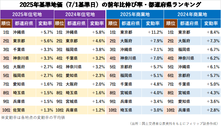 住宅地は沖縄県が2年連続で全国首位の上昇率となった。テーマパーク「ジャングリア沖縄」がある今帰仁(なきじん)村は従業員向け住宅増をにらんだ投資から11.2%上昇。県内では移住先・別荘地として需要を集める宮古島市と並んで伸び率が最高水準となった。一方、福岡県は土地価格高止まりで上昇率が鈍化。沖縄県は大型商業施設が増えて住宅地と商業地が相乗効果で上昇している。