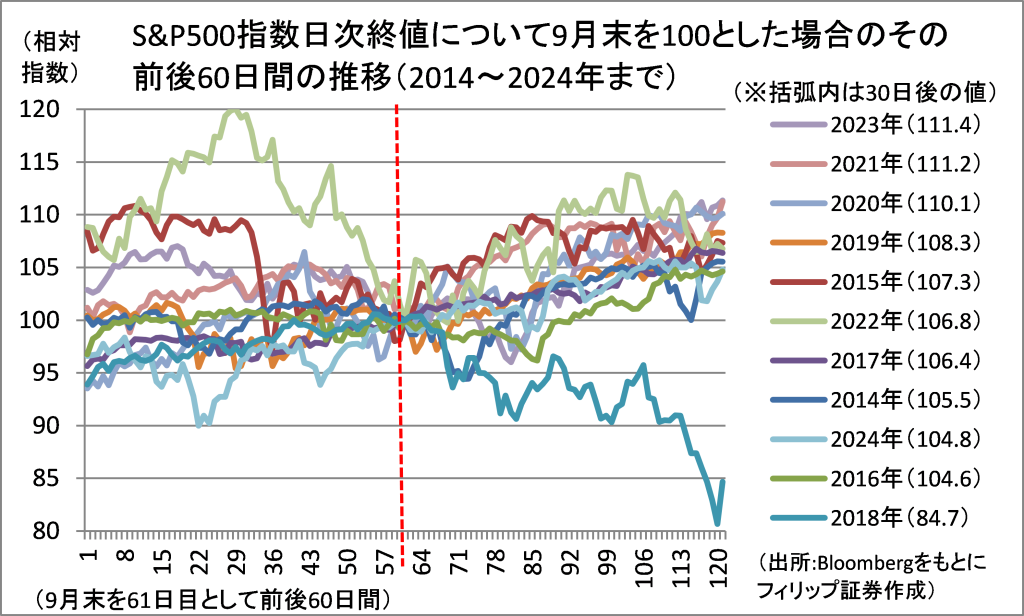 米国の財政年度は10月~翌年9月までである。そのため、9月末になると翌財政年度における予算案や債務上限の議会承認が得られなかった場合に連邦政府機関の閉鎖を警戒する動きが金融市場で発生しやすい。その一方、「つなぎ予算」が成立すればその反動に伴う安心感から、米国株市場が堅調に推移する傾向がみられる。年末商戦やサンタクロース・ラリーといったアノマリー的な動きもあり、2014~2024年の間におけるS&P500株価指数の年末終値は、2018年だけを除いて9月末を上回った。