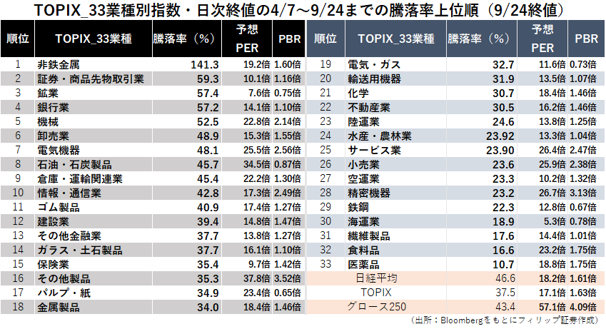 TOPIX(東証株価指数)33業種別指数の騰落率を、で日経平均株価が年初来安値を付けた4/7終値から9/24終値までの騰落率を見ると、AI(人工知能)の半導体やインフラ関連の世界的な投資の増加を受けて、半導体ICパッケージ基板向け素材やデータセンター向け光ファイバー関連業種が堅調に推移。資産価格には買われ過ぎ、売られ過ぎの後に「ミーン・リバージョン(平均回帰)」による修正の動きが出やすい点は要注意だろう。