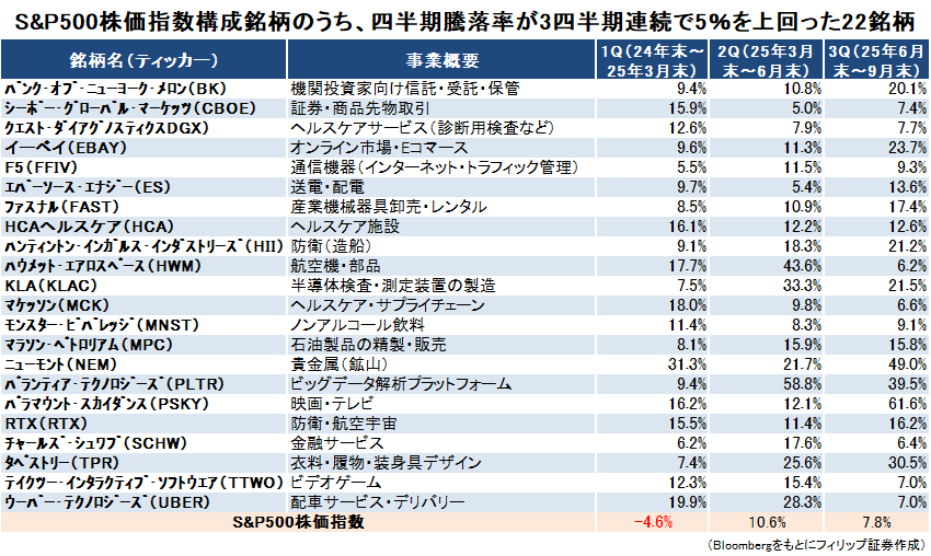 【3四半期連続で騰落率+5%超~S&P500株価指数構成銘柄の中に22銘柄】