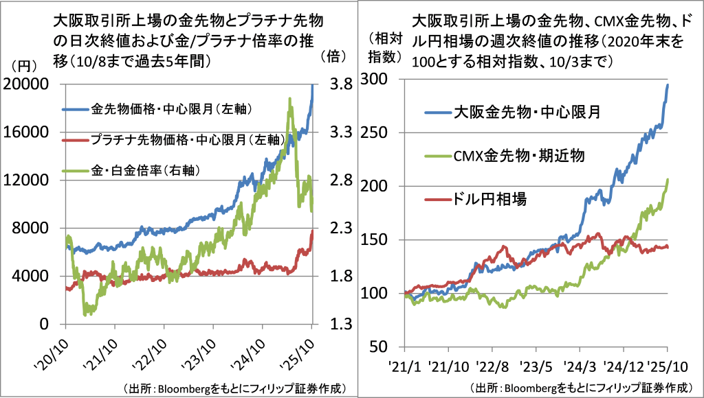 大阪取引所に上場する金先物とプラチナ(白金)先物(中心限月)の過去5年間の終値推移を見ると、金先物価格をプラチナ先物価格で割った「金・プラチナ倍率」は、2021年2月の1.4倍近辺から一貫して上昇。今年の4/22に3.65倍の水準に達した。米FRB(連邦準備理事会)による利下げ再開や、FRBの独立性の揺らぎを意識した脱ドルの動きを背景に、現物資産の貴金属へのマネー流入が加速する中、金に対して出遅れていたプラチナへの機関投資家の買いが活発化。金・プラチナ倍率は10/8に2.56倍へ低下した。供給面でプラチナはもともと金と比べて産出量が少ない点も注目される。