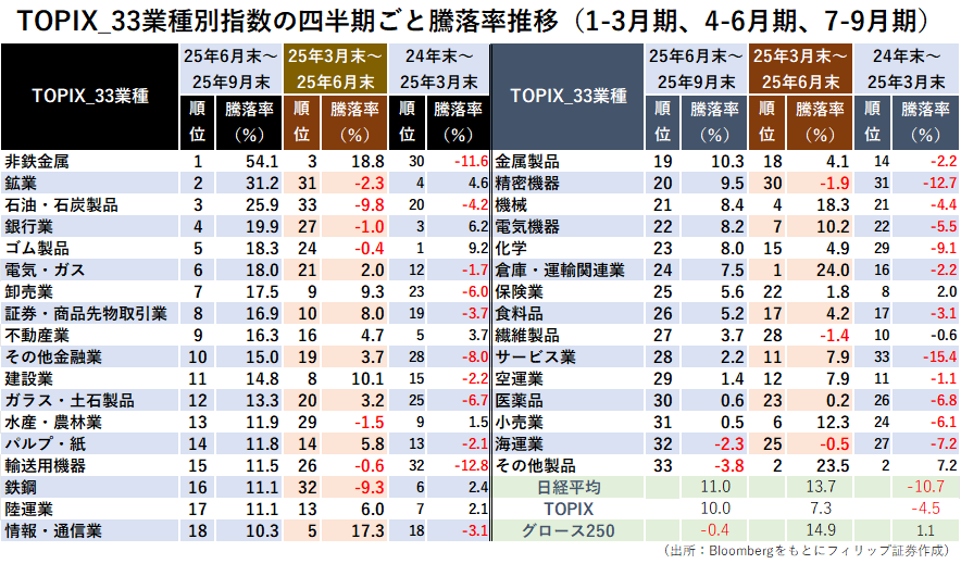 自民党の高市新総裁が「診療報酬と介護報酬の引き上げ」や赤字企業の賃金引き上げ、給付付き税額控除の制度設計などに意欲を示していることから、医薬品や小売業などは10-12月期に向けて有望な業種と捉える余地があるだろう。