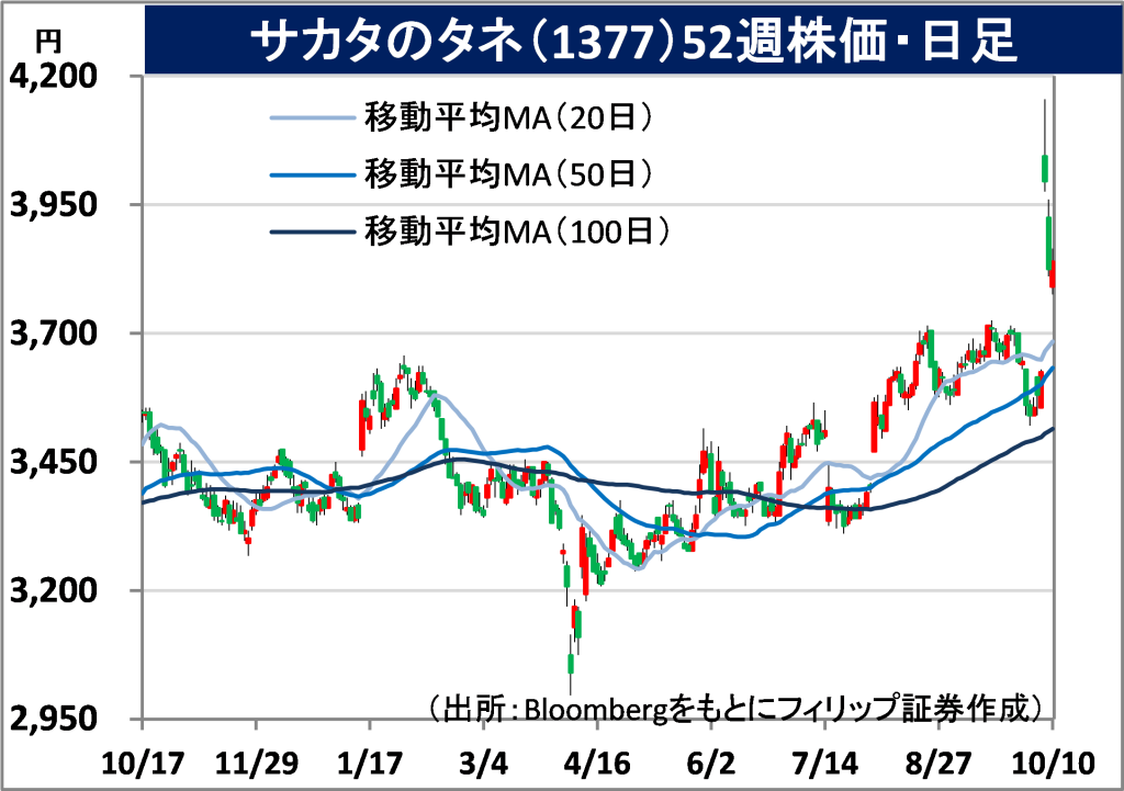 - 本日号は、サカタのタネ(1377)、ステラケミファ(4109)、テルモ(4543)、日本光電工業(6849)、ウィルマー・インターナショナル(WIL) を取り上げた。