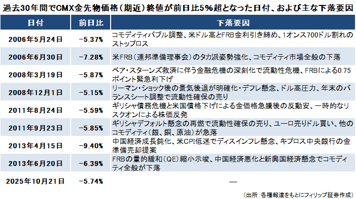 CMX金先物価格は、トランプ米大統領が米FRB(連邦準備理事会)のクック理事の解任を宣言した8月下旬から上昇基調を強め、10月に入ってペースが加速。上場投資信託(ETF)を通じて大量の資金が金市場に流入してきた中、米中対立再燃や米地銀信用リスク不安等の懸念が後退して反転下落し、短期間に積みあがった投機的なマネーが一気に崩れた。CMX金先物価格(期近)の10/21終値は前日比5.74%の大幅下落となった。