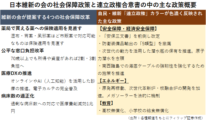 日本維新の会が自民党に閣外協力する高市政権が発足した。社会保障分野の制度改革が脚光を浴びるのは2001-06年の小泉政権以来のことだ。「維新が提案する4つの社会保障改革」に見られるように、医療・年金制度の改革は国民や業界に負担を求める性質を含む。立法府が率先して身を切ることで有権者の理解を求める必要があるだろう。医療コストの削減に貢献できる技術やサービスを提供する企業の躍進が見込まれる。
