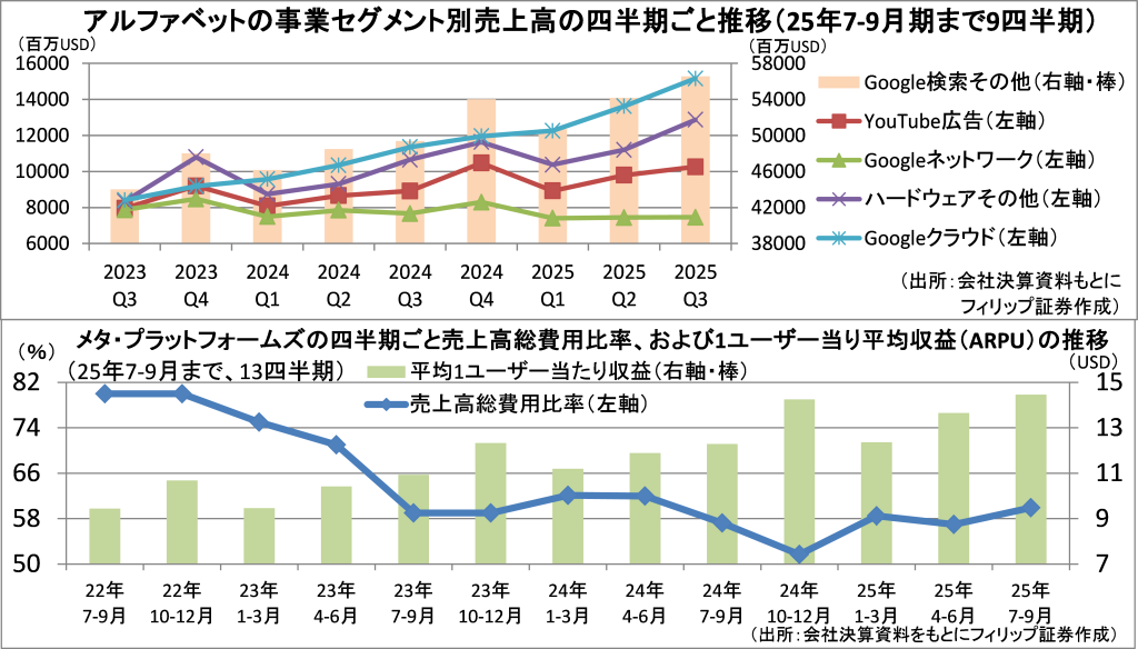 「マグニフィセント・セブン」と呼ばれる米大手ハイテク株のうち、アルファベット(GOOGL)とメタ・プラットフォームズ(META)が10/29の取引終了後に7-9月期決算を発表した。アルファベットは、前年同期比16%増収、純利益が33%増益。その中でもクラウドコンピューティング事業が34%増収、85%営業増益と伸長した。同社傘下のディープマインド社はAI(人工知能)の中核を成す深層強化学習のパイオニア的存在。アルファベットは高いAI技術を背景にネット広告でも競争優位性を保っている。