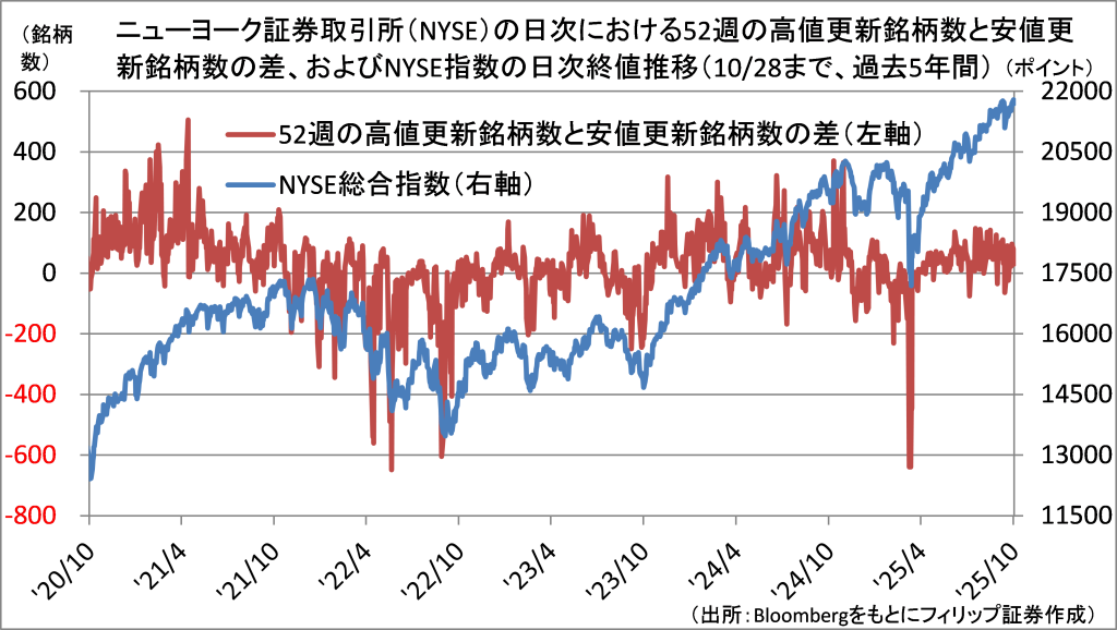 NYSE総合指数は、ニューヨーク証券取引所(NYSE)に上場している全ての普通株を対象とした時価総額加重平均型の株価指数。構成銘柄数は約2000銘柄であり、うち外国企業のADRが約360銘柄を占める。ダウ工業株30種平均やS&P500と比べて市場全体をより包括的に代表する。NYSE総合指数の構成銘柄のうち、日次終値について52週の高値更新銘柄数から安値更新銘柄数の差について、2021年後半から2022年初、および2024年10月~2025年3月頃にかけて、指数終値が上昇基調を継続している中でマイナスとなる日が増えてくると、指数終値は上昇力が鈍化し、ピークアウトから下落基調へ転換した。直近についても指数終値が上昇基調を辿る中、同様の傾向を辿る兆しが出始めている。