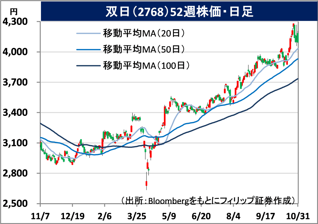 ・通期会社計画は、当期利益が前期比3.9%増の1150億円、年間配当が同15円増配の165円。同社は10/30までにオーストラリア産の希少レアアース(希土類)を初輸入。重希土類を中国以外から輸入するのは日本で初めて。今後、国内需要の3割程度を調達する見通し。同社は2023年、豪ライナスに出資。ライナスが生産するジスプロシウムとテルビウムの最大65%を日本に供給する契約を締結。