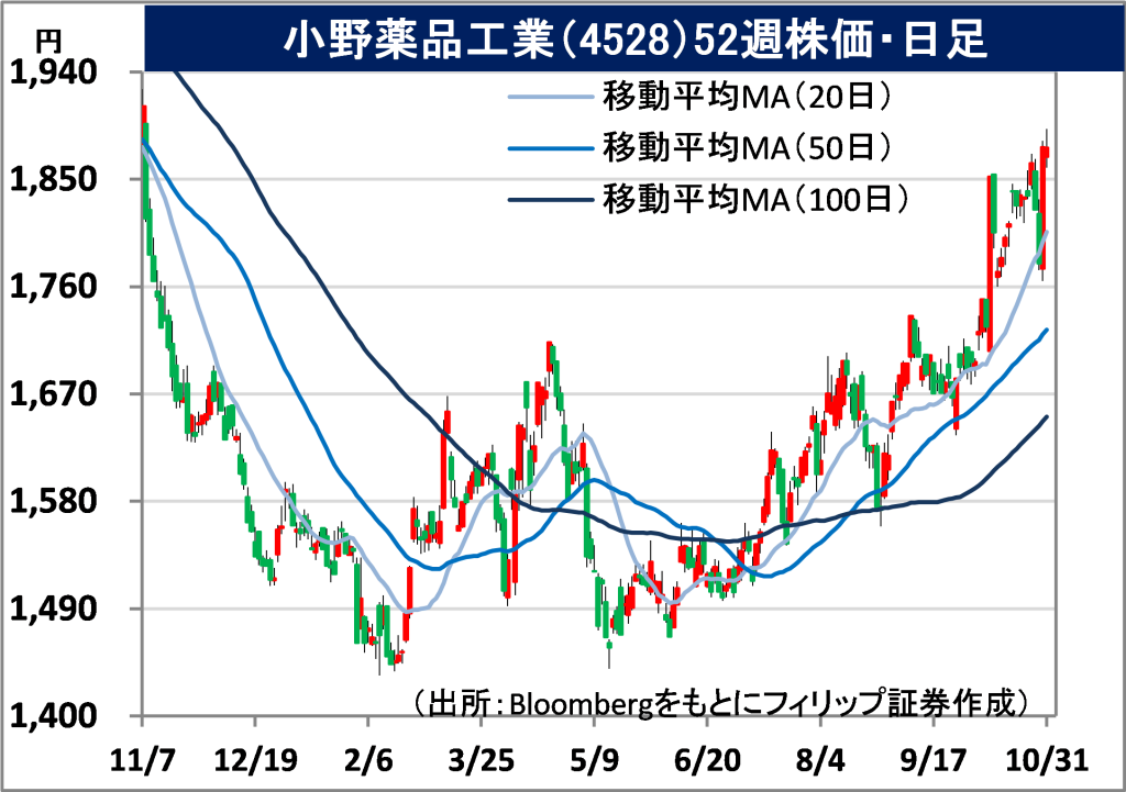 ・通期会社計画は、売上収益が前期比0.6%増の4900億円、コア営業利益が同1.2%増の1140億円、年間配当が同横ばいの80円。同社はがん領域を重要な戦略分野と位置づけ、開発パイプラインの充実を図るとともに、免疫、神経、スペシャリティ領域を重点領域に定めた創薬研究に注力。研究開発力の高さから見て、予想PER13倍台、PBR1.1倍近辺の株価は割安水準と見る余地があるだろう。