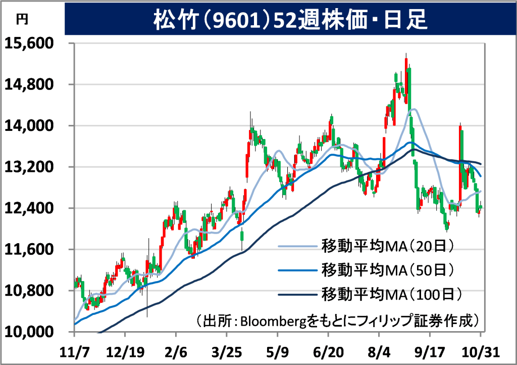 ・通期会社計画を上方修正。売上高を前期比15.5%増の970億円(従来計画950億円)、営業利益を同2.6倍の43億円(同31億円)とした。演劇事業は、映像関連のライバルである東宝(9602)が公開した映画「国宝」のヒットで歌舞伎への注目が高まる後押しを得た。歌舞伎は、「国宝」効果で新規顧客が増加したことに加え、強力な演目ラインアップ、早期の演目発表、若手役者の台頭も業績に寄与。
