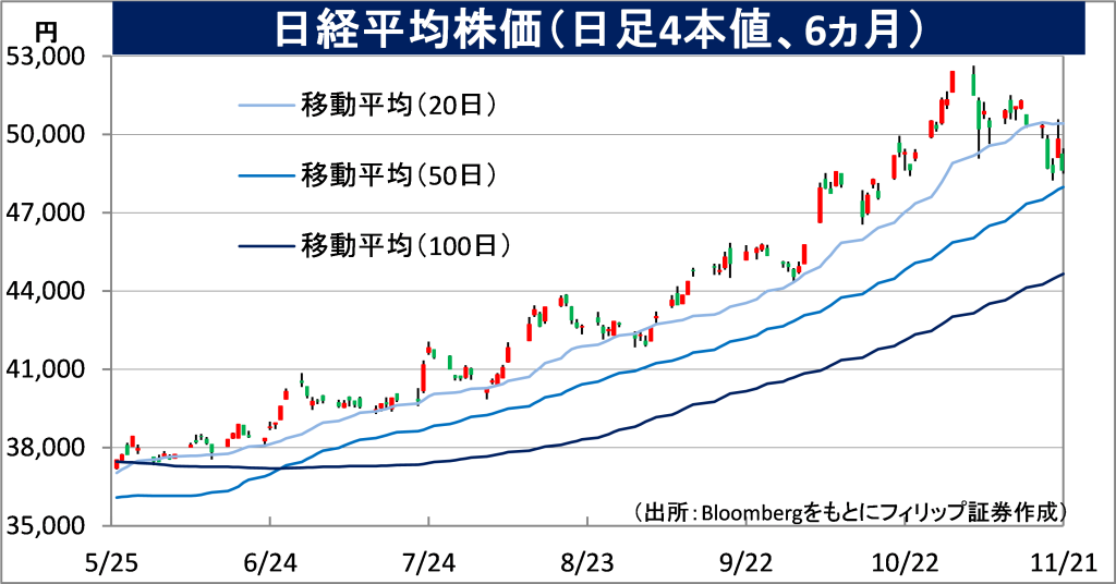 - 実際に、高市首相が11/7の衆院予算委員会で、立憲民主党の岡田元外相からの台湾有事に関する質問に対し、「存立危機事態」に当たる可能性があるとの答弁を行ったことが波紋を呼び、中国政府が日本への渡航自粛を呼びかけたほか、出荷が再開していた日本産水産物の輸入を事実上停止した。答弁の撤回を求める中国は今後、より強硬な「経済カード」を切ってくる懸念がある。リアリティ・チェックが機能し過ぎてしまったように思われる。今後日本株への売りが加速した場合、「ご祝儀相場」の起点とも言える自民党総裁選明けの10/6の寄り付き(4万6636円)近辺が意識されやすくなるだろう。
