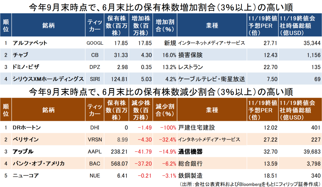 他方、グーグル親会社のアルファベット(GOOGL)のAクラス株を新たに取得した。アルファベットはAI(人工知能)半導体を内製化できるほか、傘下のディープマインド社が深層学習を主導する先駆者でもあることなど、AIに関する潜在的価値が評価されていると考えられる。