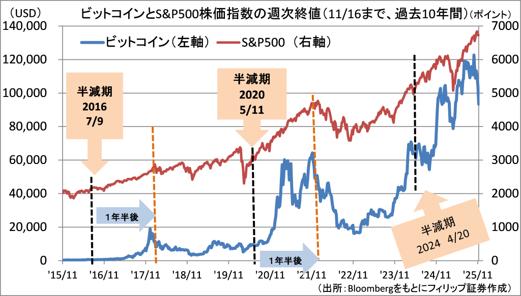 - 米国ハイテク株の比重が高い米ナスダック総合指数やS&P500株価指数は、コンピューター関連テクノロジーという共通基盤を持ち、暗号資産のビットコイン相場と相関性が高い。ビットコイン価格変動には、約4年ごとの「半減期」に伴う周期性があり、米国株にも大きな影響を与えている。この点の重要性はもっと認識されるべきだろう。