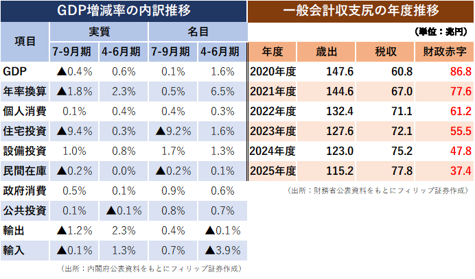 内閣府が11/17に発表した2025年7-9月期の国内総生産(GDP)速報値(実質ベース)は前期比0.4%減、年率換算で1.8%減だった。米トランプ関税、およびサービス輸出に分類される訪日外国人のインバウンド消費減少もあり、輸出が1.2%減となった。住宅投資も、今年4月の建築基準法改正によって省エネルギー基準が厳しくなったことに伴い、3月に生じた駆け込み需要の反動減が出た。