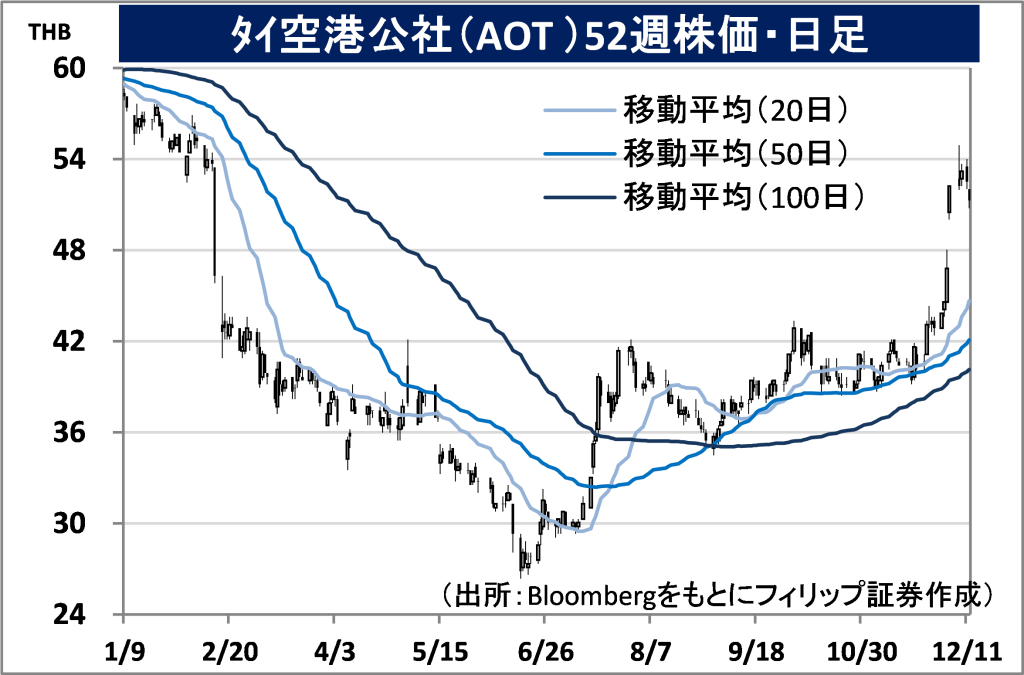 ・同社は約1000億THBを投じ、将来の観光需要を見据えて2032年までに国内主要6空港の旅客処理能力を約2倍の年2億5000万人へ拡大の方針。国内線、国際線ともに主要6空港で既に顔認証システム導入を進めている。12/4、免税品小売の国内最大手キングパワーとの免税店契約を修正することを正式承認。収益分配率の引き上げに成功したこともあり、コンセッション収入増が見込まれる。