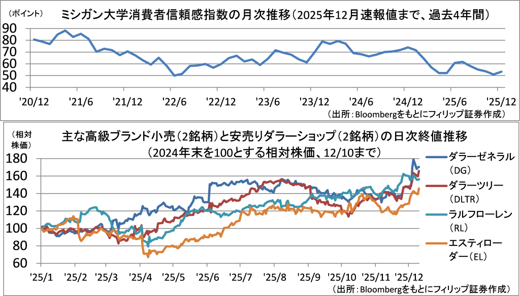 米ミシガン大学が12/5に発表した12月の消費者信頼感指数(速報値)は11月の確報値から2.3ポイント上昇。改善したものの2022年半ば付近水準にとどまり、物価高と労働市場を巡る懸念は続いている。