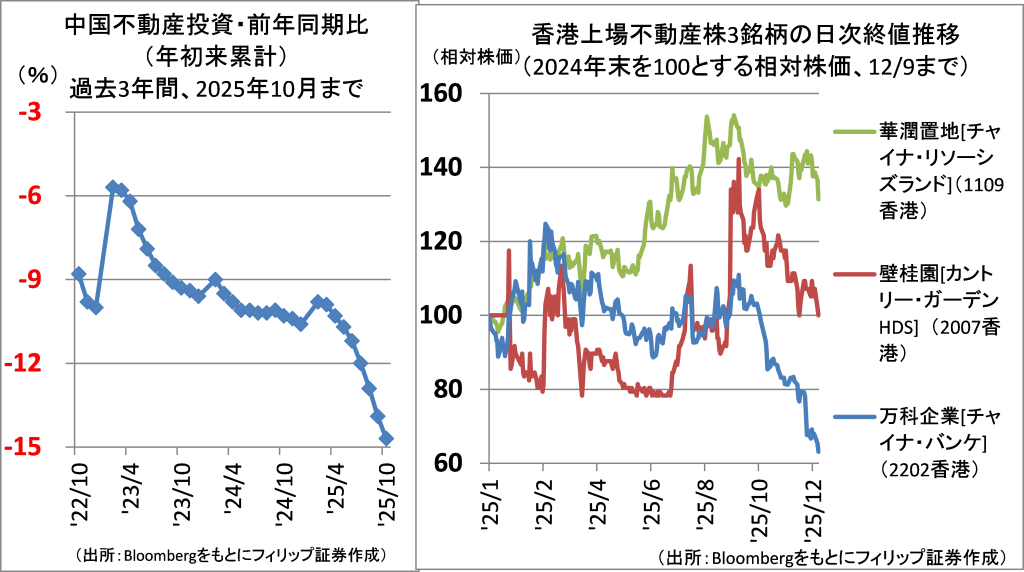 中国の不動産不況が止まらない。中国の不動産投資(1-10月累計)は前年同期比14.7%と前月比で0.8ポイント悪化。中国最大級の不動産開発会社である万科企業(2202香港)は12/10、年内償還を迎える2本の社債(12/15満期と12/28満期)の合計57億元について返済期限延長(リスケ)を協議する債権者会議を開催。さらに2026年に133億元、27年に192億元の償還が到来。また、23年にドル建て債のデフォルトに陥り、債権者から法的整理を申し立てられている碧桂園控股(2007香港)は12/4、香港の裁判所から130億USDの新株予約権付転換社債発行を原資とした計画の承認を受けた。