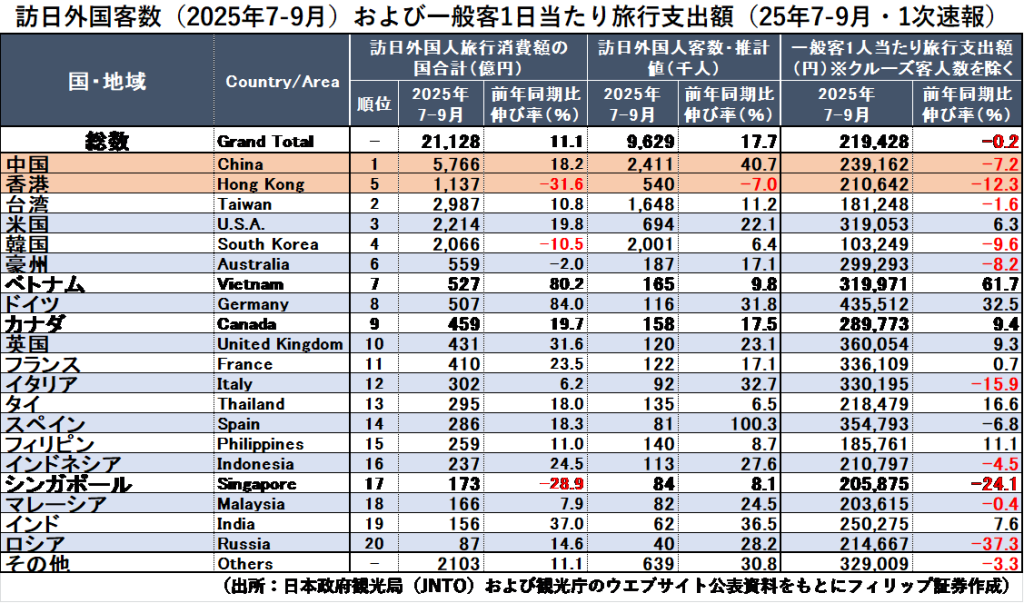 2025年7-9月期の訪日外国人旅行消費額(インバウンド消費額)は前年同期比11%増の2兆1128億円。うち中国からのインバウンド消費額のシェアは27%に上り、香港を含めると33%となる。中国と香港からの7-9月期インバウンド消費額を4倍して年率換算すると2兆7612億円。2024年度の名目GDPに対する比率は約0.45%であり、24年度の実質GDP成長率0.6%から見てもその影響は大きい。
