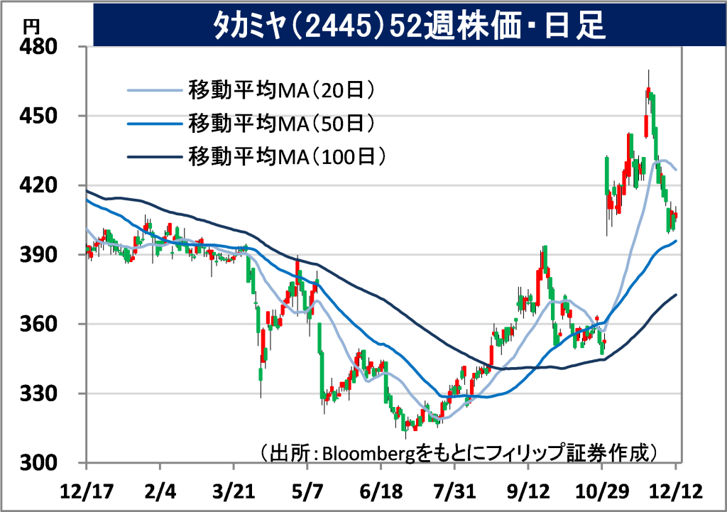 ・通期会社計画は、売上収益が前期比23.8%増の582億円、EBITDAが同27.1%増の102億円、年間配当は無配。2025年度補正予算案の18兆3034億円の歳出のうち「生活の安全保障・物価高への対応」に8兆9041億円。うち「医療・介護分野の経営支援と処遇改善」が1兆3882億円を占める。同社は支援先医療機関の月額報酬について段階的回復を見込んでおり、追い風になるとみられる。