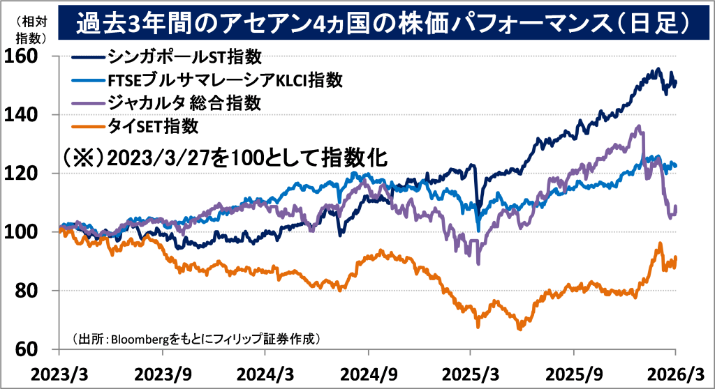 2/28の米国とイスラエルによるイランへの攻撃以降、世界の主要株価指数のうち、中東の原油や天然ガスへの依存度が高い国の株価指数が下落傾向で推移している。それに対し、マレーシアやブラジルといったエネルギー生産・輸出国の株価指数は相対的に優位となっている。マレーシアは石油製品とLNG(液化天然ガス)をエネルギー輸出の主力としており、LNGは世界有数の輸出量を誇る。ブラジルは南米最大の産油国である。