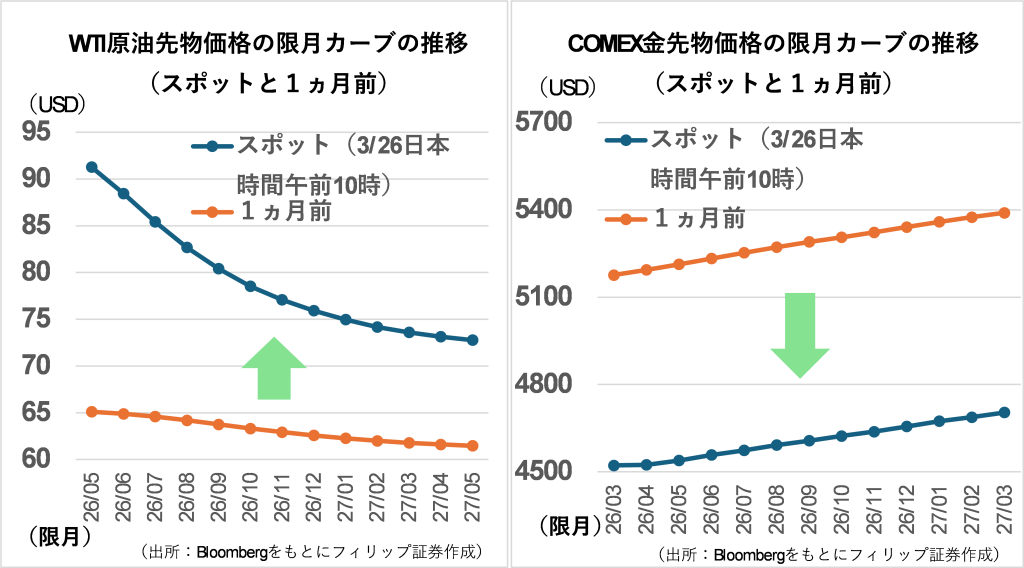 WTI原油先物は直近の中東情勢をめぐる混乱からバックワーデーションの傾きが急になった。足元の価格高騰も期先の安さが目立つ。一方で、COMEX金先物は、原油価格高騰によるインフレ懸念の高まりを受けた米長期金利上昇・米ドル高といった要因から価格下落傾向にある。それでも限月カーブの形状は変わっておらず、先高観が維持されている。