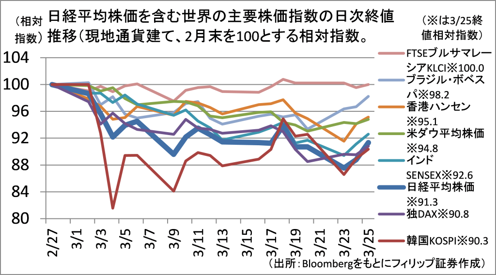 【2月末以降の世界主要株価指数~マレーシアとブラジルが相対的に優位】