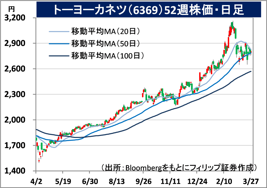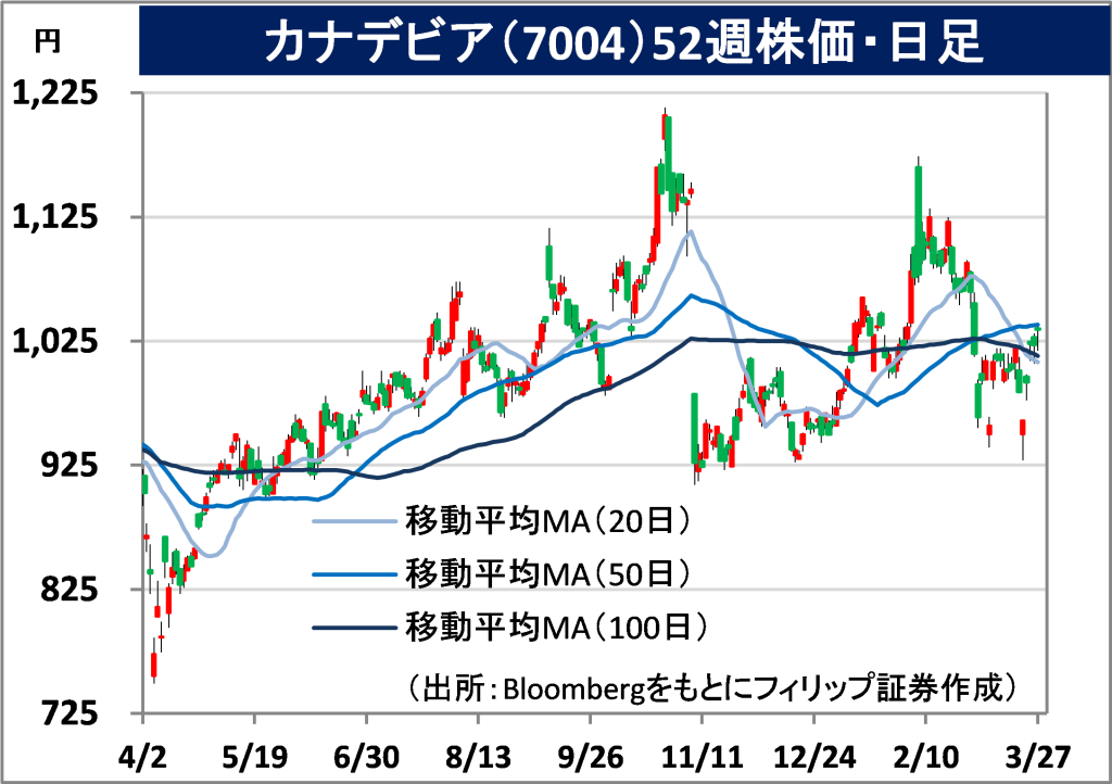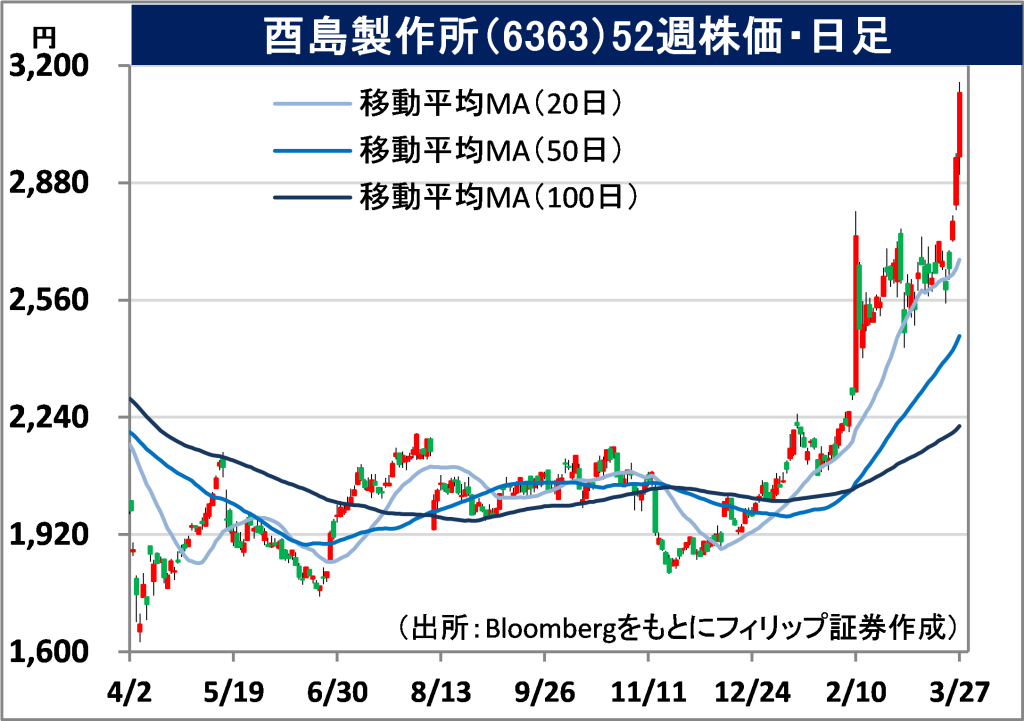 ・通期会社計画は、売上高が前期比2.9%増の890億円、営業利益が同6.4%増の58億円、年間配当が同2円増配の62円。同社は2/10、蒸気タービンやポンプに関する世界屈指の機械メーカーである新日本造機の株式を住友重機械工業(6302)から取得し子会社化すると発表。また、海外に強みを持つことから中東における海水淡水化プラントの復興需要が中期的な追い風になると見込まれる。