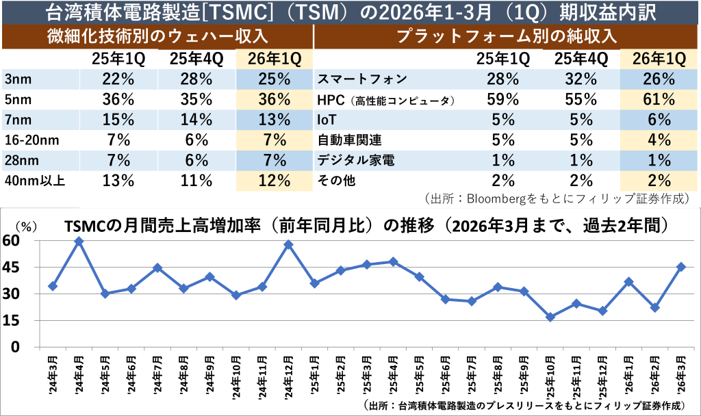 半導体ファウンドリ(受託製造)世界最大手の台湾積体電路製造[TSMC](TSM)が4/16に発表した2026年1-3月期決算は、AI(人工知能)向け先端半導体の需要が増え続けていることを受けて、前年同期比35%増収、純利益が58%増と堅調に推移した。粗利益率も会社予想の上限を超えた。データセンター向けのHPC(高性能コンピュータ)関連の売上比率が拡大傾向にある一方、最先端の3nm(ナノメートル)品の売上比率が伸び悩んでいる。これはチップレットや3次元実装(3D積層)技術により、複数のチップを最適に組み合わせることで、従来の微細化を超えた高性能化を実現していることが背景にあるとみられる。こうした動きに伴い、パッケージ基板も有機基板からガラスコア基板への転換が進んでいる。