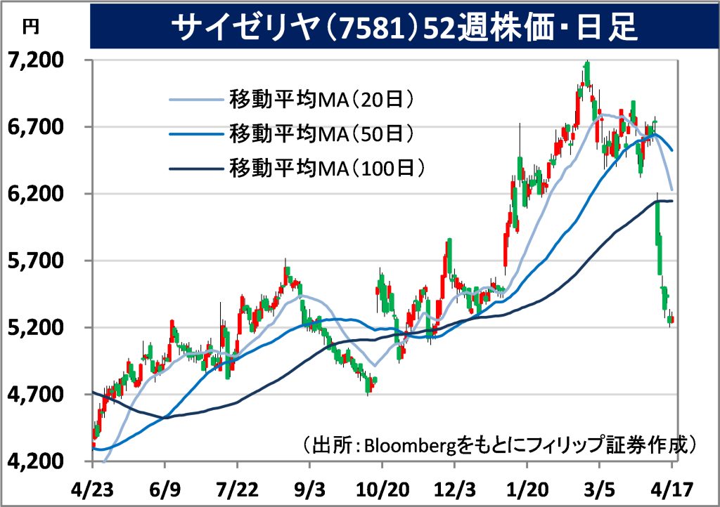 ・通期会社計画は、売上高を前期比15.7%増の2970億円(従来計画2763億円)へ上方修正の一方、営業利益を同17.4%増の182億円(同190億円)へ下方修正。年間配当は同横ばいの30円と従来計画を据え置いた。値上げに消極的な方針は市場関係者からの評価が低いものの、相対的に高収益性のアジアで、中国・成都市とインドネシアで店舗展開を進めるとしており、見直し余地がある。